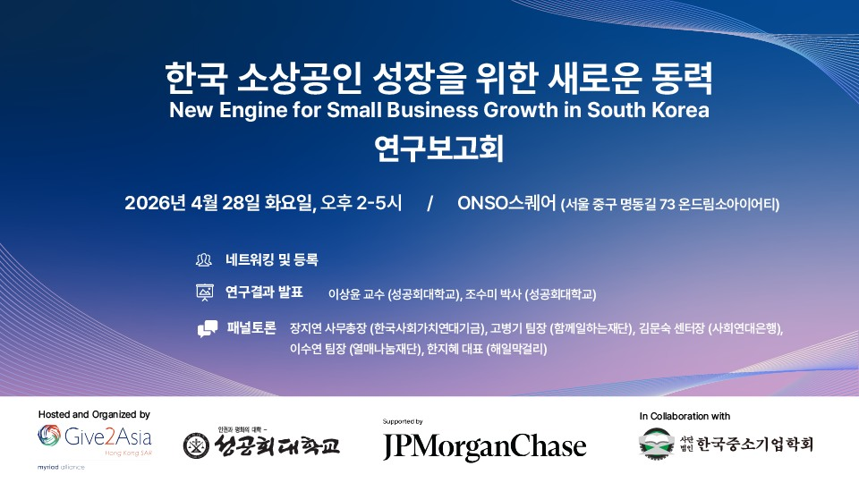 Çѱ¹Áß¼Ò±â¾÷ÇÐȸÀÔ´Ï´Ù. ¿ì¸® ÇÐȸ°¡ Çù·Â±â°üÀ¸·Î ÇÔ²²ÇÏ´Â ¾Æ·¡ ¿¬±¸º¸°íȸ¿¡ ¸¹Àº °ü½É°ú Âü¼® ºÎʵ右´Ï´Ù. Çѱ¹ ¼Ò»ó°øÀÎ ¼ºÀåÀ» À§ÇÑ »õ·Î¿î µ¿·Â ¿¬±¸º¸°íȸ ÀϽà : 2026³â 4¿ù 28ÀÏ (È) ¿ÀÈÄ2½Ã Àå¼Ò: ¼¿ï½Ã Áß±¸ ¸íµ¿±æ 73 1Ãþ ¿Âµå¸² ¼Ò»çÀÌ¾îÆ¼ ONSO ½ºÄù¾î ¹«·áÂü°¡½Åû: https://event-us.kr/wpr572qo/event/123143 "Áö¼Ó°¡´ÉÇÑ ¼Ò»ó°øÀÎ »ýŰ踦 À§ÇÑ »õ·Î¿î ¿£ÁøÀ» Á¦¾ÈÇÕ´Ï´Ù." 2024³â, ±¹Á¦ ºñ¿µ¸®Àç´Ü Give2Asia(È«Äá)°ú ¼º°øÈ¸´ëÇб³ ESG°æ¿µ¿¬±¸¼Ò´Â Çѱ¹ °æÁ¦¿¡ Áß¿äÇÑ Åä´ë°¡ µÇ´Â ¼Ò»ó°øÀο¡ ´ëÇÑ ¿¬±¸¸¦ ÁøÇàÇß½À´Ï´Ù. ƯÈ÷, ¿©¼º, û³â, Àú¼ÒµæÃþ µî ±âÁ¸ÀÇ Ã¢¾÷ »ýŰ迡¼ ÁÖ¸ñ¹ÞÁö ¸øÇß´ø â¾÷°¡µéÀ» Áö¿øÇÏ´Â ÇÁ·Î±×·¥µéÀÇ ÀÓÆÑÆ® ÃøÁ¤¿¡ µµÀüÇß½À´Ï´Ù. º» ¿¬±¸º¸°íȸ¿¡¼´Â ±× 1³â °£ÀÇ ±â·Ï°ú ¼º°ú¸¦ °øÀ¯Çϰí, ¼Ò»ó°øÀÎÀ» Áö¿øÇÏ´Â 'ÀÓÆÑÆ®'ÀÇ °¡Ä¡¸¦ ÇÔ²² ³íÀÇÇØº¸°íÀÚ ÇÕ´Ï´Ù. Çѱ¹ ¼Ò»ó°øÀÎ Áö¿øÀÇ ¹Ì·¡¸¦ ÇÔ²² °í¹ÎÇÒ ÀÌÇØ°ü°èÀÚ ¿©·¯ºÐÀ» ÃÊ´ëÇÕ´Ï´Ù. #ÃÊ´ëÇÕ´Ï´Ù! - ¼Ò»ó°øÀÎ Áö¿ø ¹× »çȸÇõ½Å ºÐ¾ß °ü°èÀÚ - ±â¾÷ CSR ´ã´çÀÚ ¹× ÀÓÆÑÆ® ÅõÀÚÀÚ - ºñ¿µ¸®Àç´Ü ¹× Áß°£Áö¿øÁ¶Á÷ ½Ç¹«ÀÚ - ¼Ò»ó°øÀÎ Á¤Ã¥ ¹× »çȸ¿¬´ë°æÁ¦ ¿¬±¸ÀÚ #Çà»ç ÁÖ¿ä³»¿ë - <New Engine for Small Business Growth in South Korea> ÇÙ½É ¿¬±¸ °á°ú ¹ßÇ¥ - ¿©¼º, û³â, Àú¼ÒµæÃþ ¼Ò»ó°øÀÎ Áö¿øÇÁ·Î±×·¥ÀÇ ÀÓÆÑÆ® Áø´Ü - ÇöÀå Àü¹®°¡ ÆÐ³Î Åä·Ð: ¼Ò»ó°øÀÎ »ýŰèÀÇ °ÝÂ÷ ÇØ¼Ò¿Í Çù·ÂÀÇ È®Àå - Âü°¡ÀÚ °£ ³×Æ®¿öÅ· ÃßÈÄ Çù·Â ±âȹ ¸ð»ö #¼¼ºÎ ÇÁ·Î±×·¥ - 14:00-14:30 µî·Ï & ³×Æ®¿öÅ· - 14:30-14:45 °³È¸Àλç - 14:45-15:10 ¿¬±¸°á°ú ¹ßÇ¥ ÀÌ»óÀ± ±³¼ö (¼º°øÈ¸´ëÇб³), Á¶¼ö¹Ì ¹Ú»ç (¼º°øÈ¸´ëÇб³) - 15:10-15:50 ÆÐ³ÎÅä·Ð »çȸ: ÀåÁö¿¬ »ç¹«ÃÑÀå (Çѱ¹»çȸ°¡Ä¡¿¬´ë±â±Ý) ÆÐ³Î: °íº´±â ÆÀÀå (ÇÔ²²ÀÏÇÏ´ÂÀç´Ü), ±è¹®¼÷ ¼¾ÅÍÀå (»çȸ¿¬´ëÀºÇà), À̼ö¿¬ ÆÀÀå (¿¸Å³ª´®Àç´Ü), ÇÑÁöÇý ´ëÇ¥ (ÇØÀϸ·°É¸®) - 15:50-16:00 ÆóȸÀλç - 16:00-17:00 ³×Æ®¿öÅ· #Âü¼®ÇϽŠºÐµé²² - ±¹¹®/¿µ¹®º¸°í¼ - ´Ù°ú - ¼ÒÁ¤ÀÇ ±â³äǰÀ» µå¸³´Ï´Ù. |
